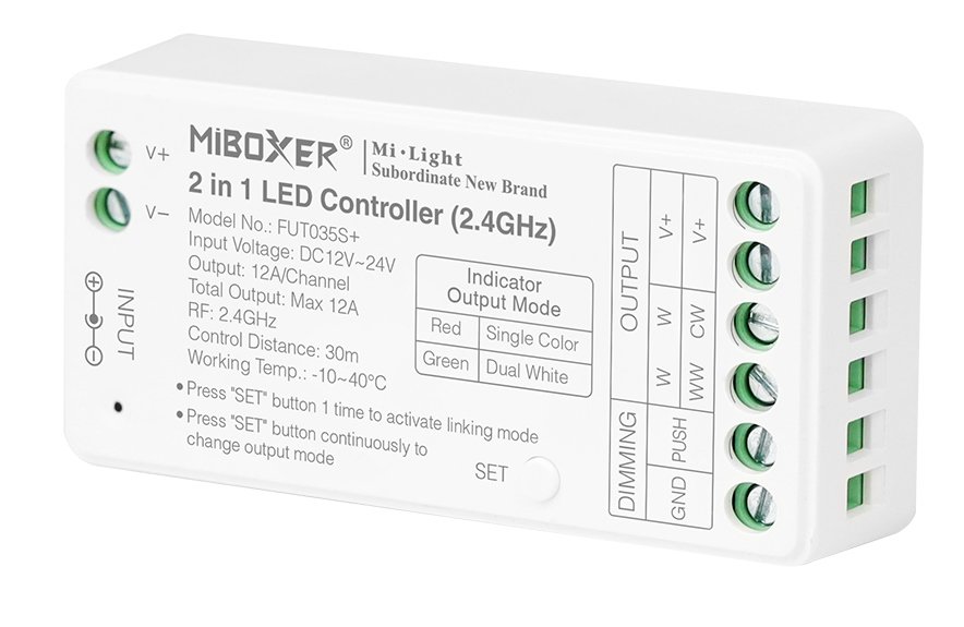 Controlador 2 en 1 (CCT y monocolor ) 2,4G. Tensión de entrada:12~24V. Permite variar la intensidad y la tonalidad (en caso de tiras CCT). Salida máxima 12A. Compatible con pulsador.
