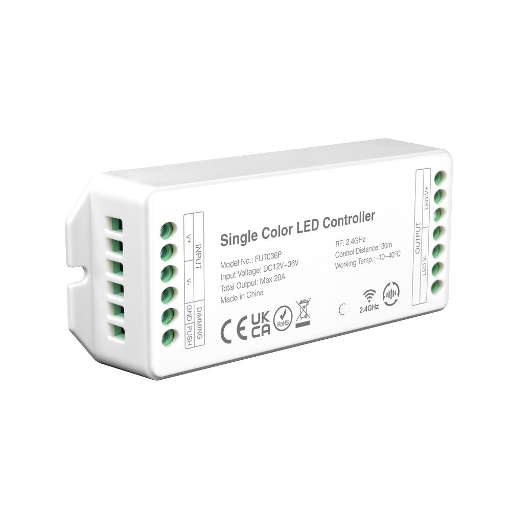 Regulador 2.4G monocolor. Permite controlar la intensidad lumínica.Tensión de trabajo: 12 a 36 Vdc. Compatible con Alexa, Google Home y móvil (se precisa puerta de enlace WL-Box1) hasta 30m de distancia. Compatible con pulsador sin necesidad de equipo adicional. Salida máxima (20A por canal; 20A total).