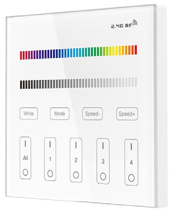 Panel táctil para el control remoto de la intensidad y color de productos RGBW de hasta 4 zonas independientes. Tecnología de transmisión inalámbrica RF 2.4G. Funciona con dos pilas AAA.