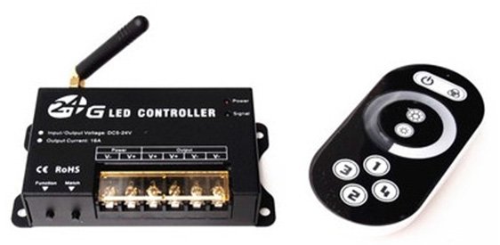 Regulador de intensidad para tiras led monocolor con mando a distancia RF 2.4G y con posibilidad de conectar 4 reguladores con un solo mando. Intensidad máxima: 16A por canal. Potencia máxima: 192W a 12 Vdc y 384W a 24 Vdc.