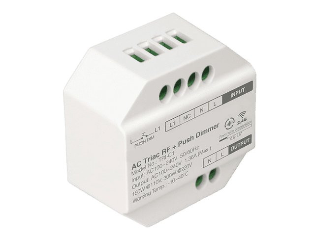 Regulador led Triac para pulsador y 2.4 GHz RF. Tensión de entrada:100-240 Vac y tensión de salida: 100-240Vac. Potencia máxima de 300W a 220 Vac. Compatible con los mandos FUT006 y FUT007 y paneles B1/T1 y B2/T2 así como con la puerta de enlace WL-Box1